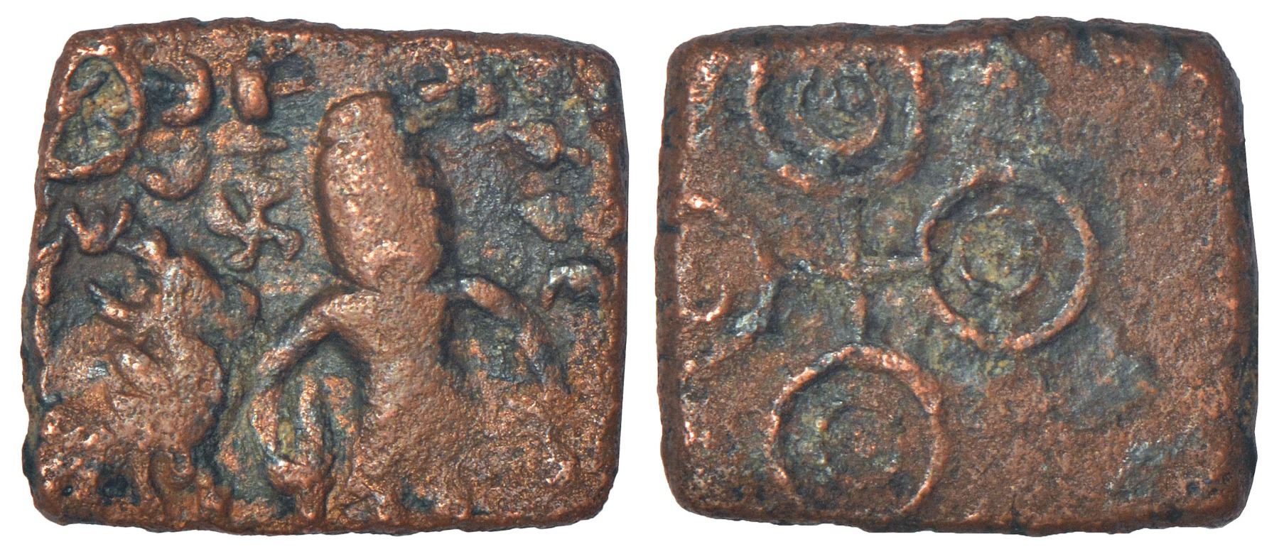 Ancient Malwa - post-Mauryan uninscribed die-struck copper coin of Ujjain area, 'standing man' type, (c.250-200 BC), PAIC 662, 4.06g. Obv: Man with staff and water-pot standing facing, bull to left, wheel with arrow-spokes above, tree to right. Rev: 'Ujjain' symbol with concentric orbs.