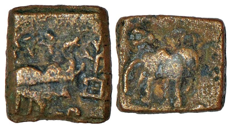 Ancient Marathwada / Western Vidarbha - uninscribed die-struck copper coin of pre-Satavahana period (c.200-150 BC), unpublished in major sources, 2.45g. Obv: Elephant with trunk raised facing right, tree-in-railing to right; traces of small 'symbols above. Rev: Bull walking to right, traces of a symbol above.