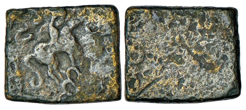 Ancient Marathwada / Western Vidarbha - uninscribed die-struck copper coin of pre-Satavahana period (200-150 BC), unpublished in major sources, 2.81g. Obv: Lion with curved tail standing on a six-arched hill; traces of other symbols above. Rev: Traces of 'Ujjain' symbol and a tree-in-railing.