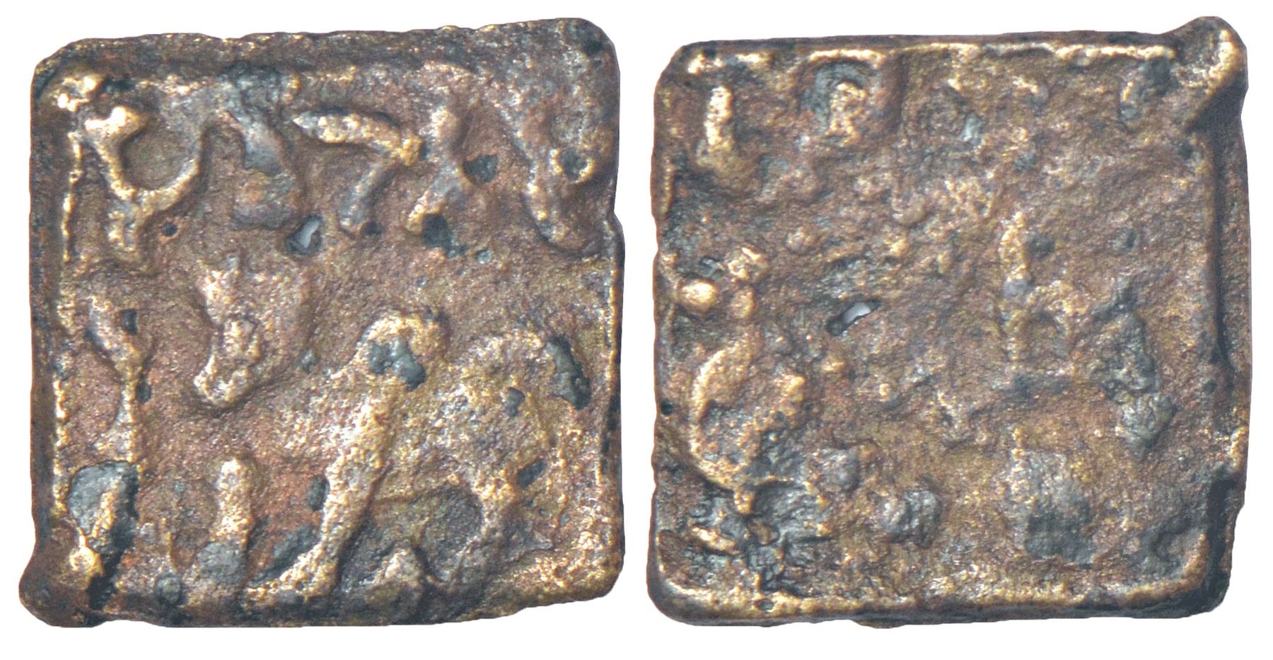 Ancient Saketa region - monarchical cast coinage of Ayodhya area, 'bull'-type coin of Sivadatta (c.150-100BC), PAIC 1048, 1.52g. Obv: Bull walking to left; Brahmi legend Sivadatasa above. Rev: Tree-in-railing in centre, uncertain devices to left and right.