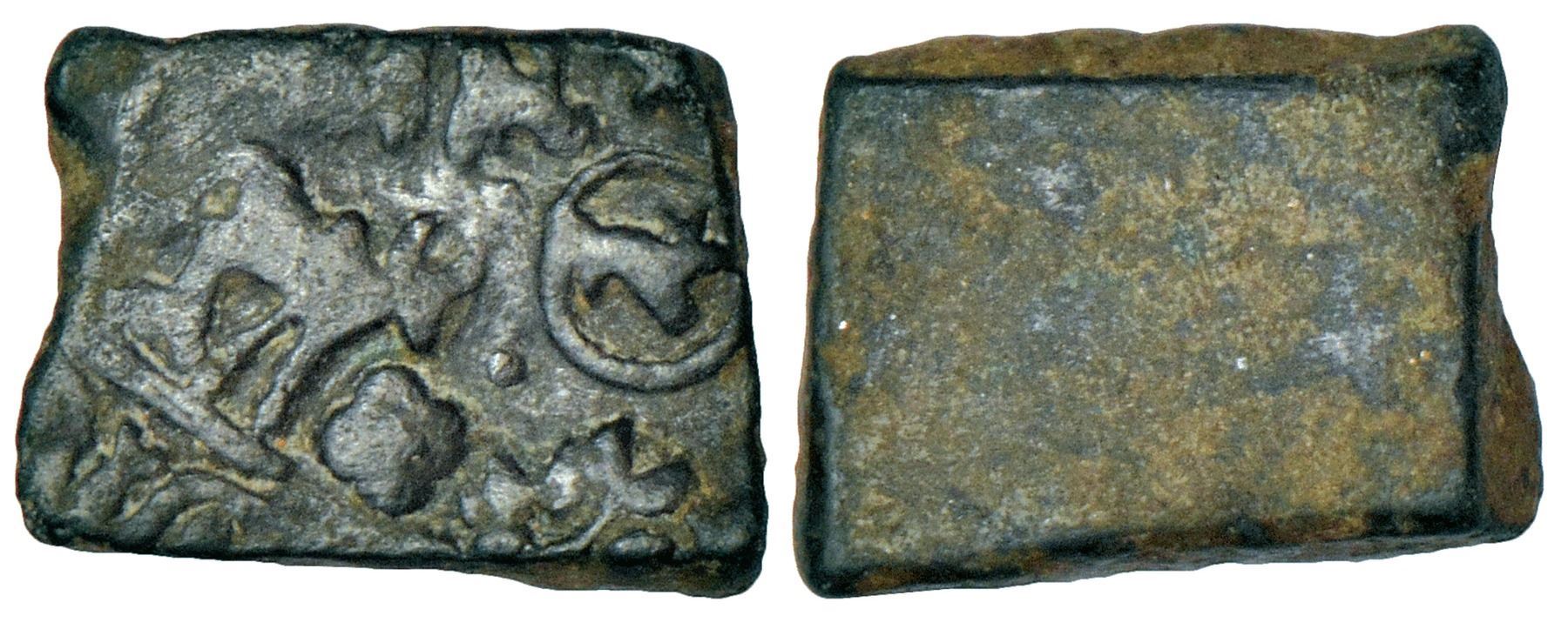 Ancient Vidarbha, post-Mauryan local kingdom, copper coin of Damabhadra, (200-150 BC), MATEC 4745-4748, 3.60g. Obv: Bull standing facing right, small symbol in his fron, wavy line with dots below, tree-in-railing to right, circle with rabbit to top left, brahmi legend …(ma)bhadasa above the bull. Rev: Blank.