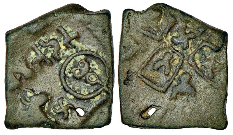 Ancient, copper coin of Dharmabhadra, a 'hadra' ruler from Eastern Vidarbha, 3.10g. Obv: Bull facing right, Swastika in its front, a composite symbol of Nandipada-standard within a circle to right; Brahmi legend (Dha)mabhadasa above. Rev: An ornate symbol of stylized 'open cross' with Swastika in the centre, taurines within boxes and Nandipadas in quadrants.