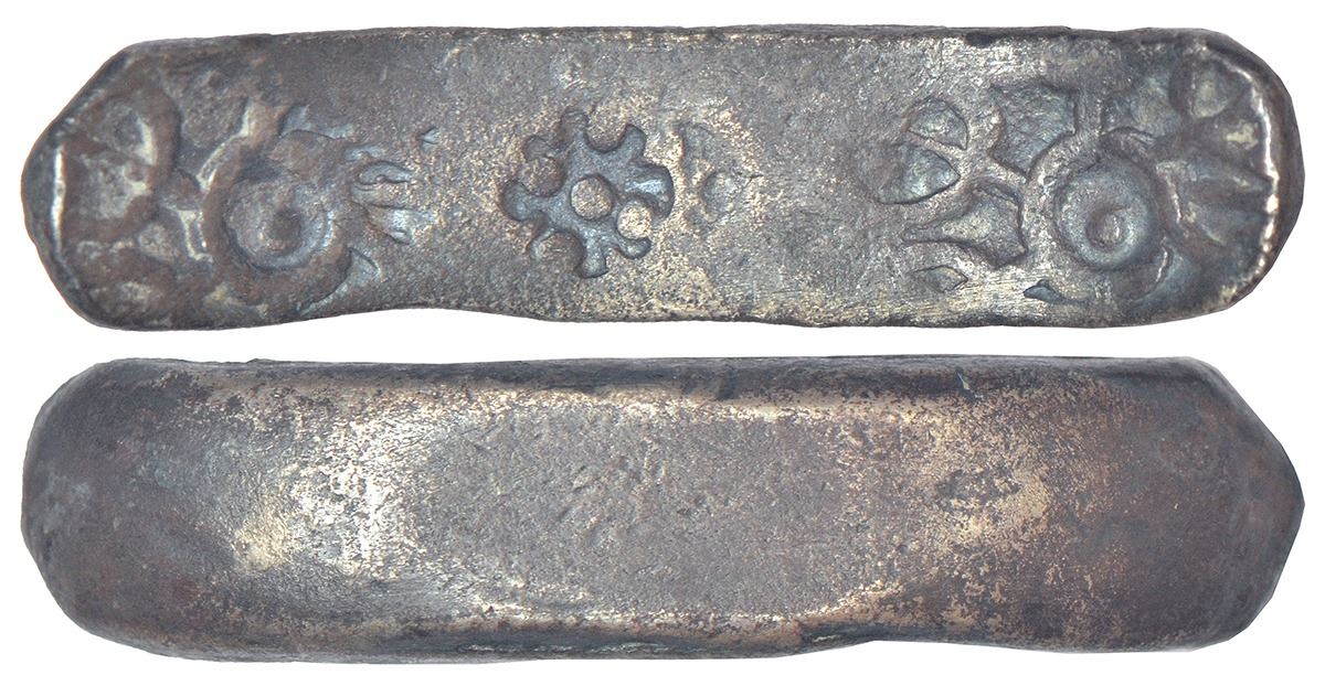 Archaic silver punch marked 'bent bar' coin, attributed to 'Gandhara Janapada' (c.600-300 BC), early-middle type, flat bar with wide flan, Rajgor Series 34, 11.23g. Obv: Two punches with radiating circles on either end of the bar, with a small dotted solar symbol in center. Rev: Plain.