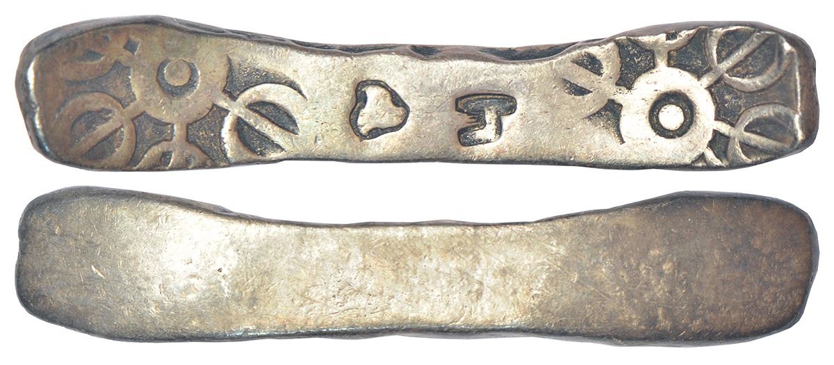 Archaic silver punch marked 'bent bar' coin, attributed to 'Gandhara Janapada' (c.600-300 BC), middle type, flat bar with narrow flan, Rajgor Series 34-35, 10.70g. Obv: Two punches with radiating circles on either end of the bar, two small ancillary symbols in center. Rev: Blank.