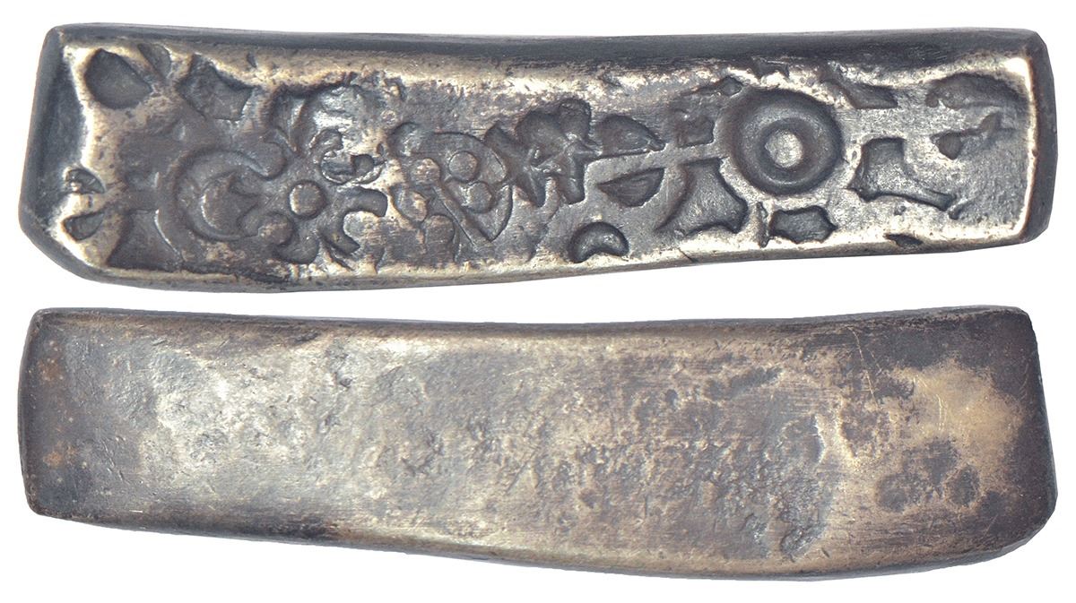 Archaic silver punch marked 'bent bar' coin, attributed to 'Gandhara Janapada' (c.600-300 BC), middle type, flat bar with narrow flan, Rajgor Series 34-35, 10.64g. Obv: Two punches with radiating circles on either end of the bar, with small ancillary symbols in center. Rev: Blank.