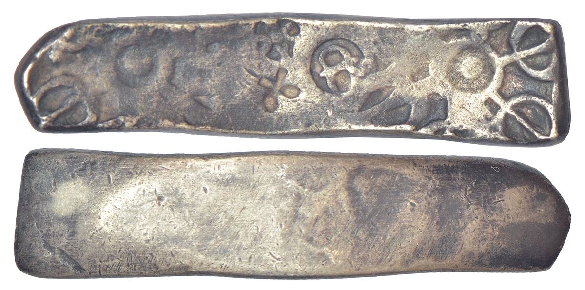 Archaic silver punch marked 'bent bar' coin, attributed to 'Gandhara Janapada' (c.600-300 BC), middle type, flat bar with narrow flan, Rajgor Series 34-35, 11.00g. Obv: Two punches with radiating circles on either end of the bar, with small ancillary symbols in center. Rev: Blank.