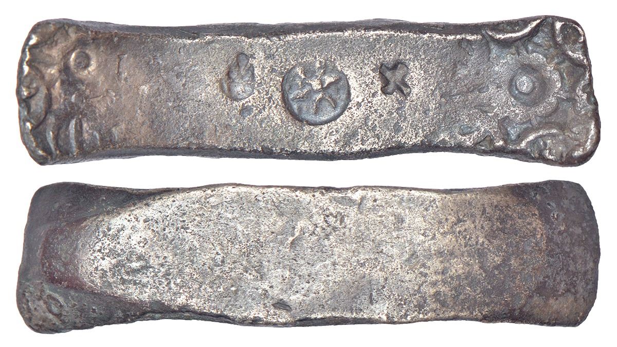 Archaic silver punch marked 'bent bar' coin, attributed to 'Gandhara Janapada', (c.600-300 BC) - early type, flat bar with wide flan, Rajgor Series 34, 11.23g. Obv: Two punches with radiating circles on either end of the bar, with small 'Taxila mark' symbol in centre. Rev: Blank.