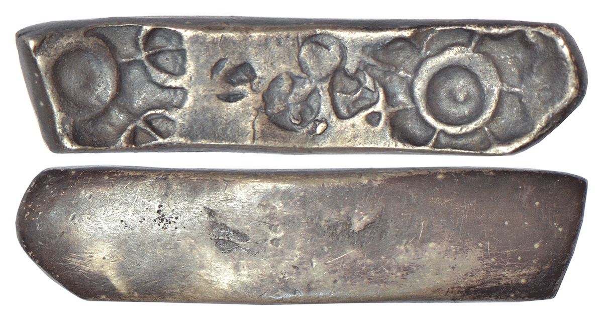 Archaic silver punch marked 'bent bar' coin, attributed to 'Gandhara Janapada', (c.600-300 BC) - early type, flat bar with wide flan, Rajgor Series 34, 10.66g. Obv: two punches with radiating circles on either end of the bar, with small 'Taxila mark' and some other symbols in centre. Rev: blank.