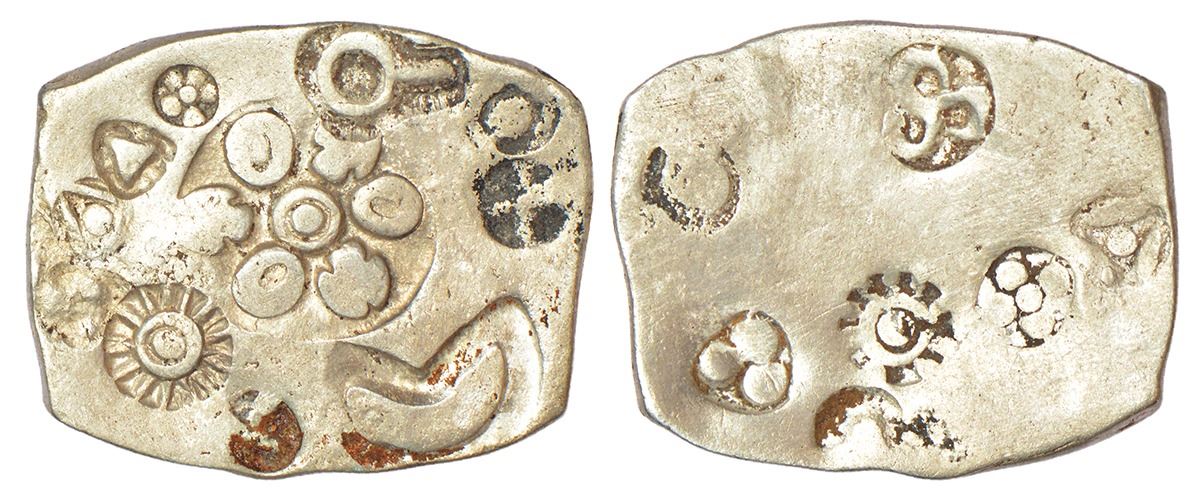 Ancient India: Archaic silver punch-marked coin - Bihar series, generally attributed to 'Magadha Janapada' of pre-imperial period, (c.450-400 BC), struck to Vimshatika standard, Rajgor Series 10, 5.37g. Obv: Four punches - 1. Sun, 2. Six-armed symbol (in centre), 3. Crescent, 4. Sacrificial spoon; other smaller marks around. Rev: Minor 'banker's marks'.
