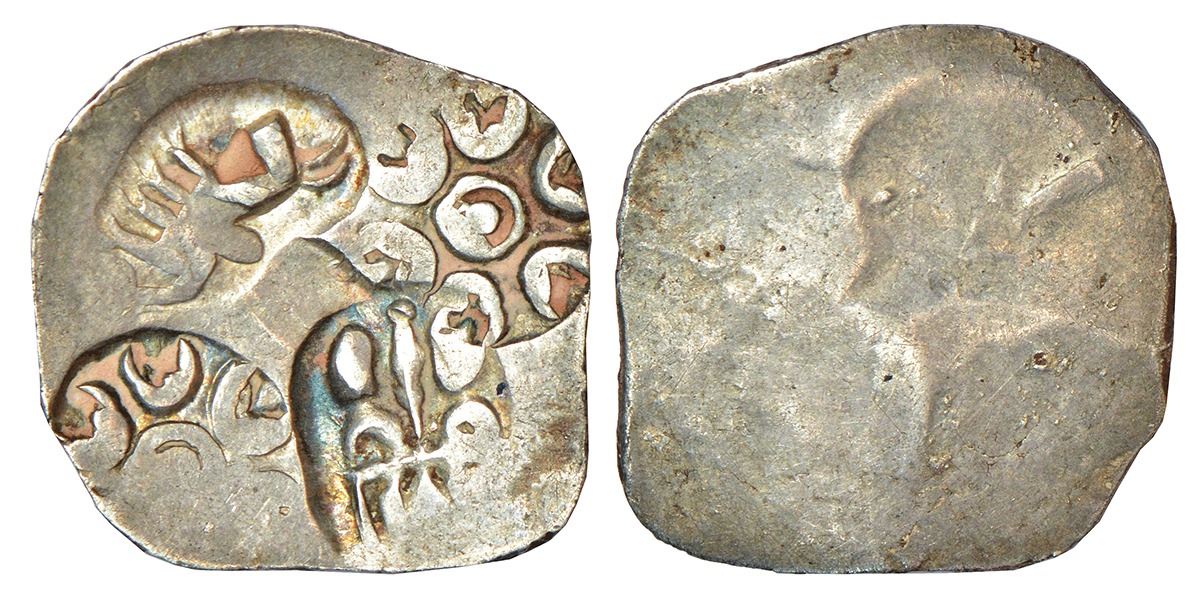 Archaic silver punch-marked coin - lower Tons river system, attributed to 'Chedi' or 'Kalinga' Janapada, (c.400-350 BC), ABBC configuration, Karshapana standard, not listed in Rajgor or MATEC, 3.44g. Obv: four punches - 1x bull facing left, 2 x six-semircircles, each with an annulet, surrounded a circle with a dot, and 1x ploughshare without oxen resembling a 'candelabra'.