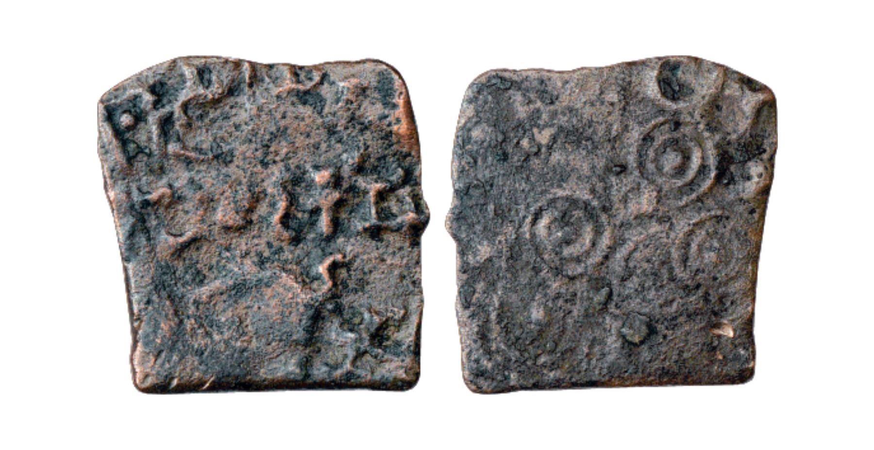 Ancient, copper coin attributed to Siri Satakani (100-50 BC), 'Obverse-Obverse / Reverse-Reverse' counterstrike, 2.80g. Obv: Outlines of elephant and traces of legend visible; Undertype: Raño Siri Sada… Overtype: … Sadakamnisa. Rev: Two 'Ujjain' symbols superimposed.