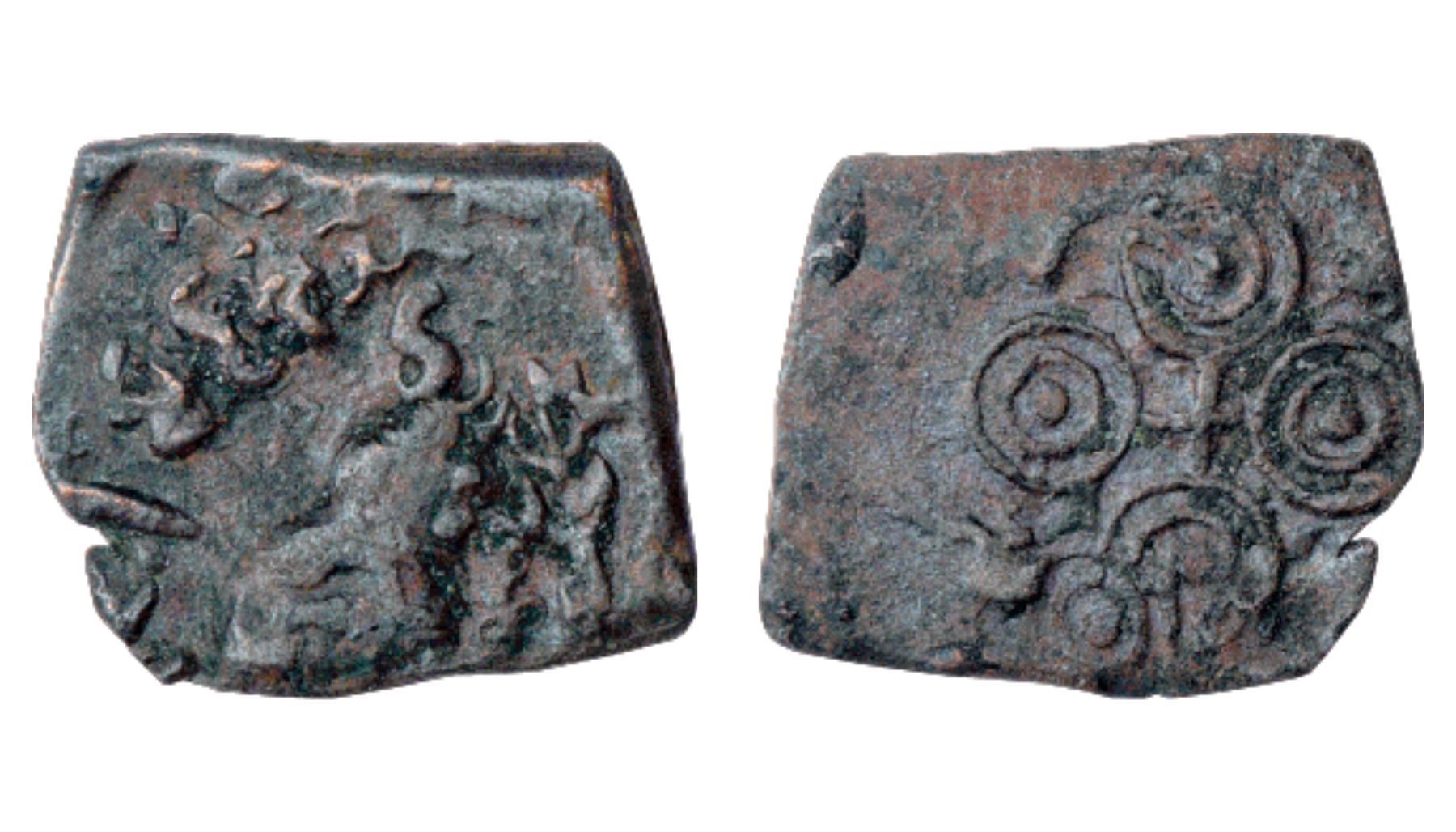 Ancient, copper coin attributed to Siri Satakani (100-50 BC), 'Obverse-Obverse / Reverse-Reverse' counterstrike, 3.94g. Obv: Elephant and tree-in-railing of the overtype; Undertype: Not much of the obverse visible. Overtype: …ri Sadakamni… Rev: Two 'Ujjain' symbols superimposed.