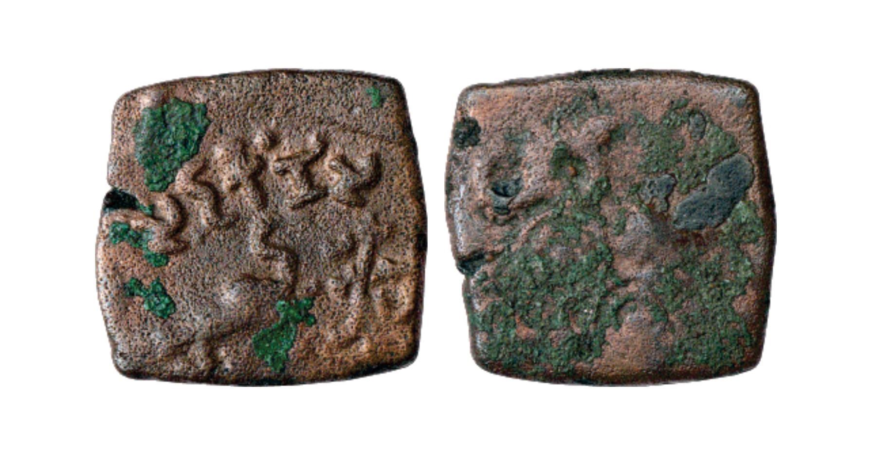 Ancient, copper coin attributed to Siri Satakani (100-50 BC), 4.74g. Obv: Elephant with trunk upraised, walking to right, tree-in-railing in front; brahmi legend … Sadakamnisa above. Rev: Bold 'Ujjain' symbol with concentric circles as orbs and one of them modified as a Nandipada; Shrivatsa in one quadrant.