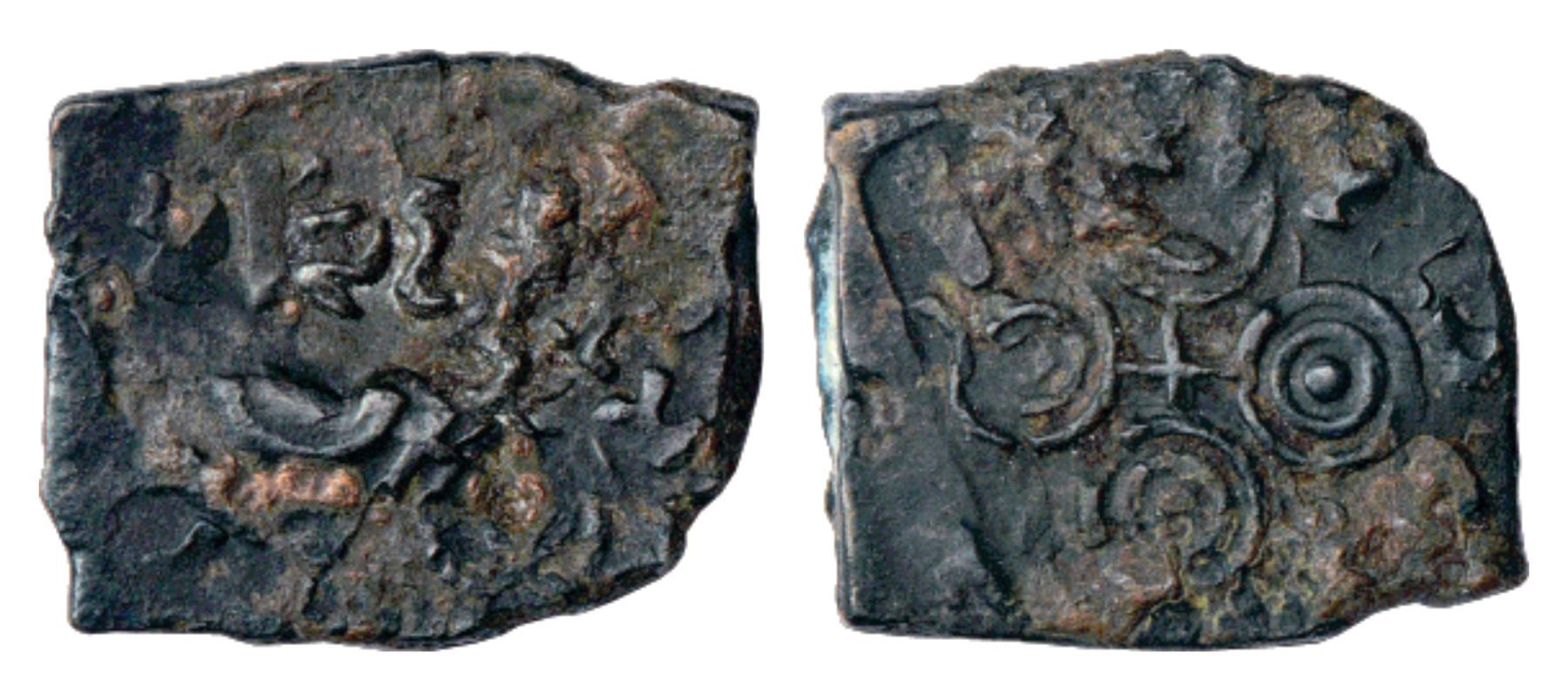 Ancient, copper coin attributed to Siri Satakani (100-50 BC), 8.04g. Obv: Elephant with upraised trunk of the overtype counterstruck on 'Ujjain' symbol; Overtype: …Siri Sadakamni… visible. Rev: 'Ujjain' symbol struck over traces of undertype; Undertype: Raño Siri Sada… visible.
