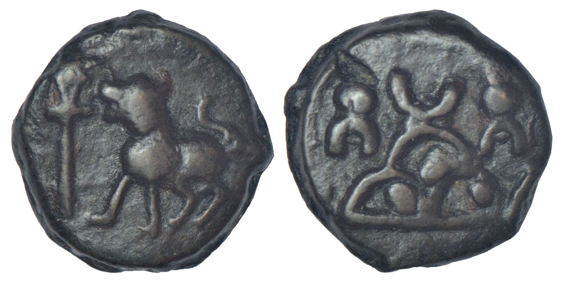 Early Uninscribed Cast Copper Coinage (EUCCC) - Punjab series, 'lion' type, (c.250-200 BC), PAIC 353, 4.64g. Obv: Lion facing left; triangle-headed standard to left. Rev: Three-arched hill with crescent on top and dots within arches, flanked by inverted taurines.