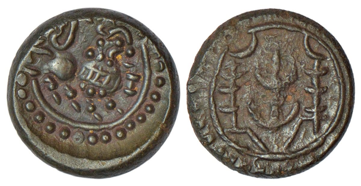 Eastern Chalukyas - fractional coin in alloyed copper attributed to Vishnuvardhana I alias Vishamasiddhi (624-641 AD), unpublished in major sources, 2.44g. Obv: roaring lion facing right, Brahmi letter Shri above. Rev: Shrivatsa between two lamp posts, within a rayed circle.
