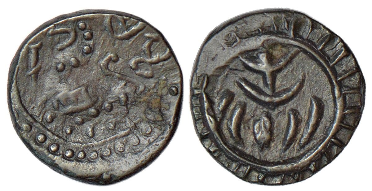 Eastern Chalukyas - fractional coin in alloyed copper attributed to Vishnuvardhana I alias Vishamasiddhi (624-641 AD), unpublished in major sources, 1.37g. Obv: roaring lion facing left, a dagger in front of its gaping mouth; Brahmi legend …sha ma above. Rev: Shrivatsa resting on lotus within a rayed circle.