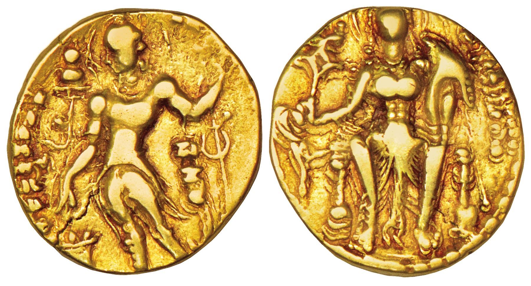 The stylistic execution of this coin suggests it to be a product of a different mint, most likely located in the Western part of the Gupta Empire, where the engravers preferred a more slender and 'monumental' expression of motifs close to sculptural depictions. During Samudra Gupta's reign, this mint was at its nascent stage and very few coins of this slender style exist. Judging from available specimens the style proliferated in Chandra Gupta II's reign and later, became the exclusive idiom for Gupta gold coins.