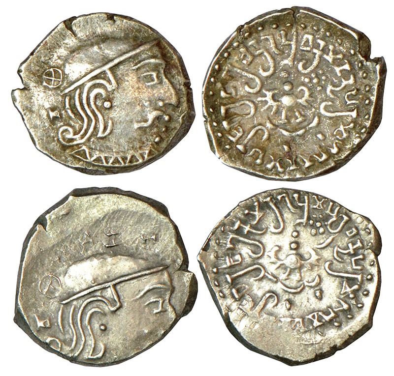 Gupta Empire, two historically significant silver drachms. (A) silver drachm of Chandra Gupta II (375, 415 AD), 'Western India' type, dated GE90, S Kumar Class I, 2.12 g. Obv: Profile bust of king to right, date Va 90 behind the head. Rev: Garuda emblem in centre, Brahmi legend from 3 o'clock Parama Bhagavata Maharajadhiraja Shri Chandra Gupta Vikramaditya around. (B) silver drachm of Kumara Gupta I (415-450 AD), 'Western India' type, S Kumar Class I, dated GE90, 2.13g. Obv: Profile bust of king to right, date Va 90 behind the head. Rev: Garuda emblem in centre, dotted sun to right; Brahmi legend Parama Bhagavata Maharajadhiraja Shri Kumara Gupta Mahendraditya around. (2 coins)