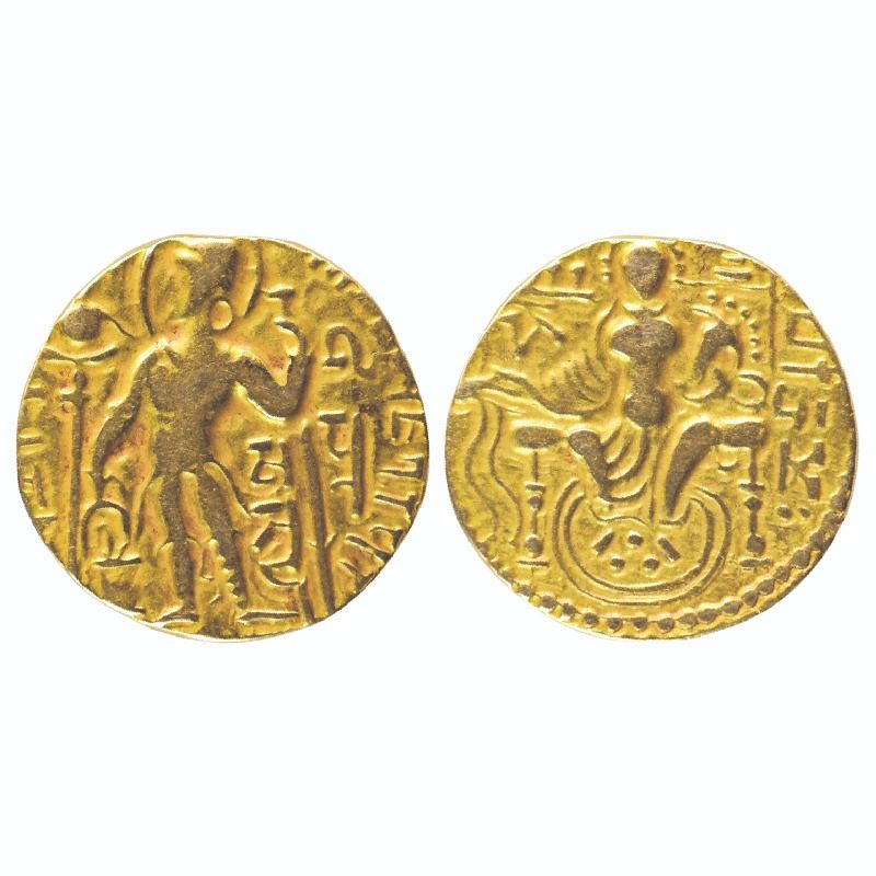Guptas, Samudragupta (c. 335-380 AD), Gold Dinar, 7.40gms, ’Standard’ type, Obv: King nimbate standing left with halo, holding standard and sacrificing at an altar, garuda banner behind, the king wearing a Kushan style but short coat and dhoti embellished with dots even on the sleeves and headdress, with Brahmi legend ’Samudragupta’ around Brahmi legend ‘Samara [Shata Vitata Vijayo] Jita Ripurajito [Divam Jayati]’, Rev: Goddess Lakshmi seated on a backless throne, she holds diadem in right hand and cornucopia in left hand with tamgha to left and Brahmi legend ’Parakramah’ in the right field (Altekar 1G, S. Kumar, TOTGE, Class II, var. E).