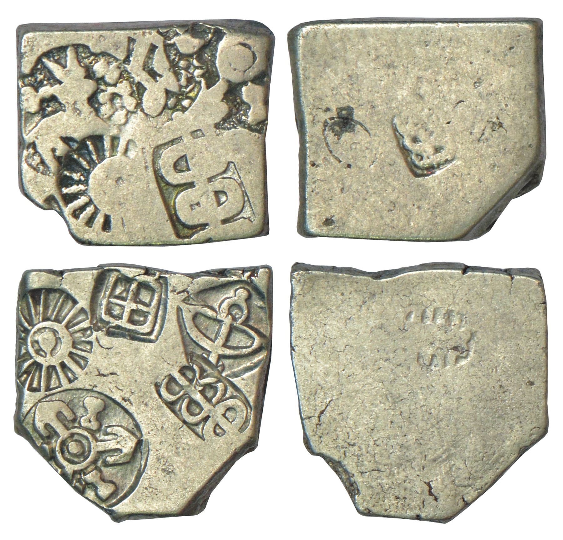 Imperial Magadhan punch-marked Karshapana silver coins (2) - GH series Va, (A) 3.28g. Obv: Five punches - 1. Sun, 2. six-armed symbol, 3. Deer/bull nibbling at a tree in railing, 4. Tree, 5. Caduceus. Rev: Small banker's mark (caduceus) and (B) PAIC 257, 3.35g. Obv: Five punches - 1. Sun, 2. Six-armed symbol, 3. Box grid, 4. Bow and arrow, 5. Caduceus. Rev: Small banker's mark. (2 coins)