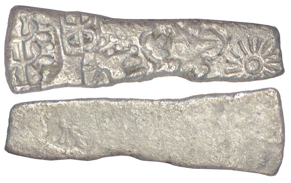 Imperial Magadhan silver punch-marked Karshapana coin (c.370-320 BC), GH series Vb, no. 510, 2.84g. Obv: Five punches: 1. Sun, 2. Six -armed symbol, 3. Tree-in-railing, 4. Cow/deer facing a small tree, 5. Caduceus. Rev: Small 'peacock on hill' symbol.