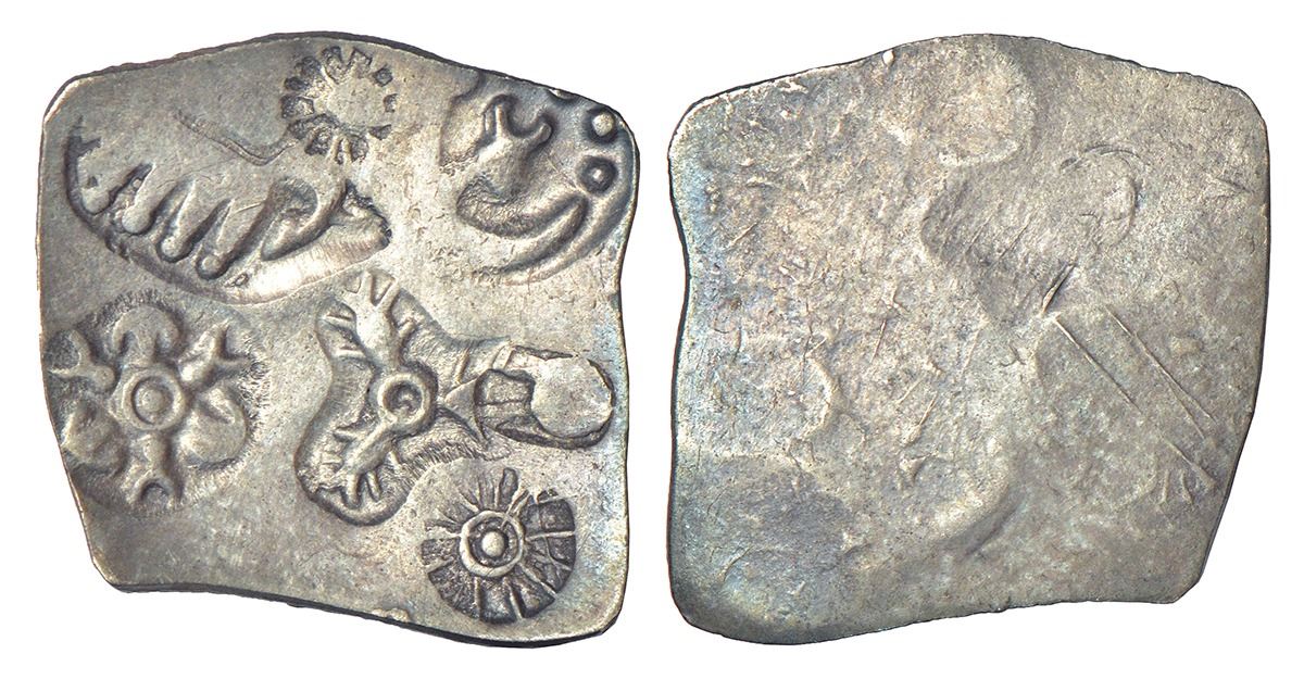 Imperial Magadhan silver punch-marked Karshapana coin (c.400-350 BC), GH series I, no. 233, 3.38g. Obv: Five punches - 1. Sun, 2. Six-armed symbol, 3. Three fishes around a dot, 4. Taurine in crescent and dots, 5. Elephant to right.