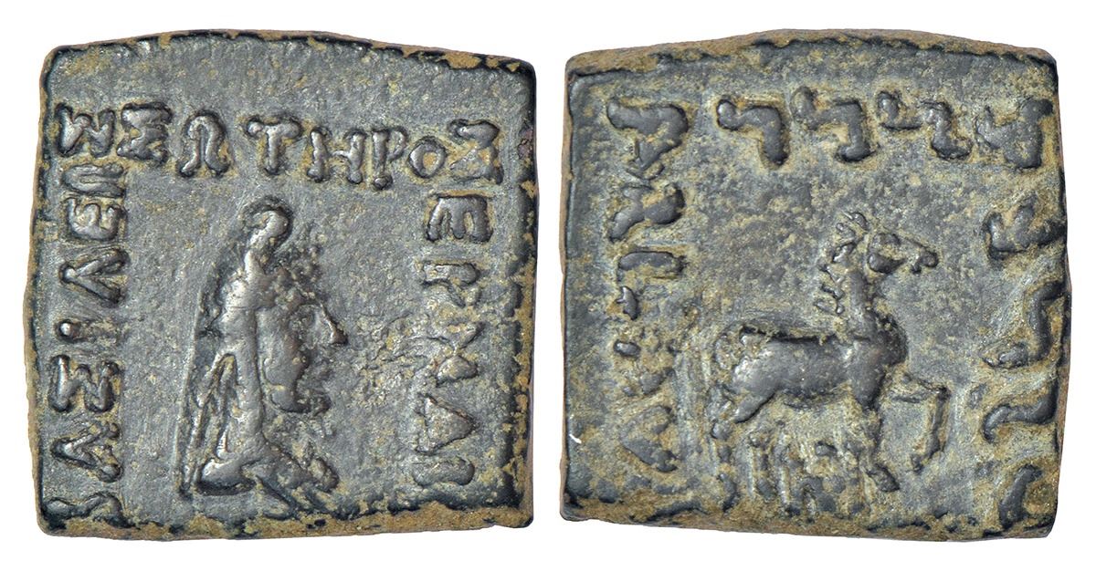 Indo-Greeks, copper coin of Hermaios (c.90-70 BC), BN series 9, 8.65g. Obv: bust of bearded Zeus wearing Phrygian cap; Greek legend BASILEOS SOTEROS ERMAIOU. Rev: horse prancing to right; Kharoshthi legend Maharajasa Tratarasa Heramayasa.