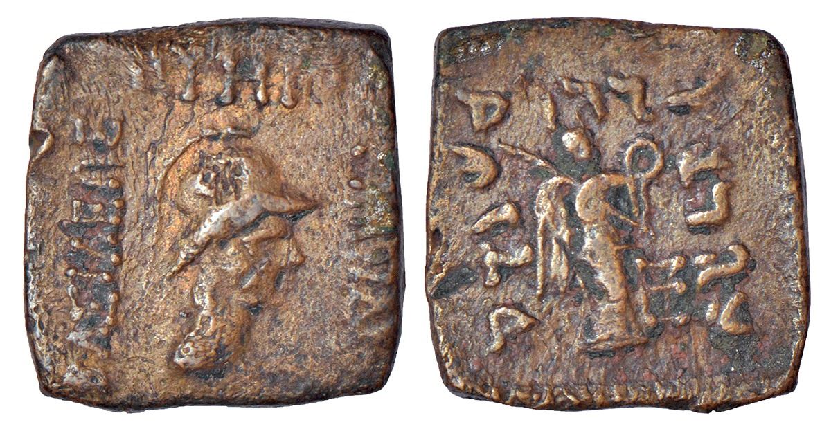 Ancient India: Indo-Greeks, copper unit of Menander I (c.155-130 BC), BN series 31, 5.40g. Obv: helmeted bust of Athena facing right, Greek legend BASILEOS SOTEROS MENANDROU around. Rev: winged Nike walking to right, holding a diadem and palm frond; Kharoshthi legend Maharajasa Tratarasa Menadrasa around, monogram in right field.