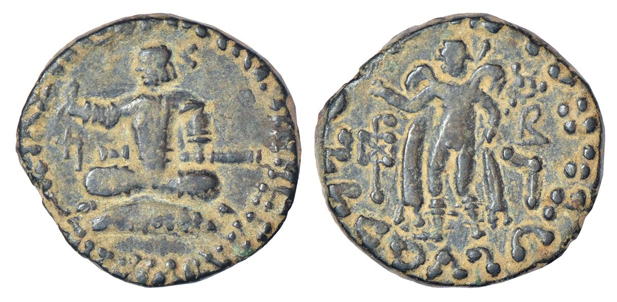 Indo-Scythians, copper unit of Azes (c.45-12 BC), ISCH 107.11, 8.56g. Obv: king seated on cushion, with legs crossed, raising hand with sword in the lap, Kharoshthi letter Ji to left; traces of Greek legend around. Rev: Hermes standing left, raising hand and holding kerykeion; monogram to left, Greek letter B and Kharosthi letter to right; Kharoshthi legend Maharajasa... Mahatasa Ayasa around.