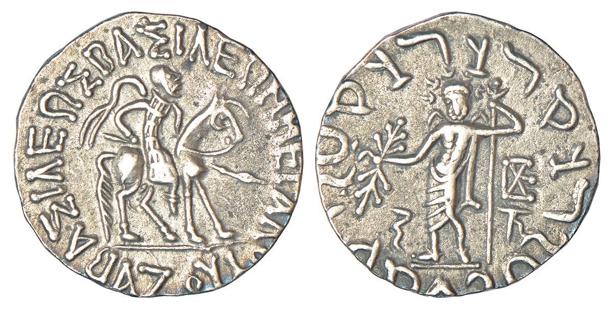 Indo-Scythians - silver tetradrachm of Azes (c. 45-20 BC), ISCH 80.41T, 9.62g. Obv: king riding on horse holding spear; Greek legend BASILEOS BASILEON MEGALOU AZOU around. Rev: Zeus standing facing, holding sceptre and thunderbolt; Kharosthi letter Dhra to left, monogram above Kharosthi letter Bha to right, Kharoshthi legend MaharajasaRajarajasa Mahatasa Ayasa around.
