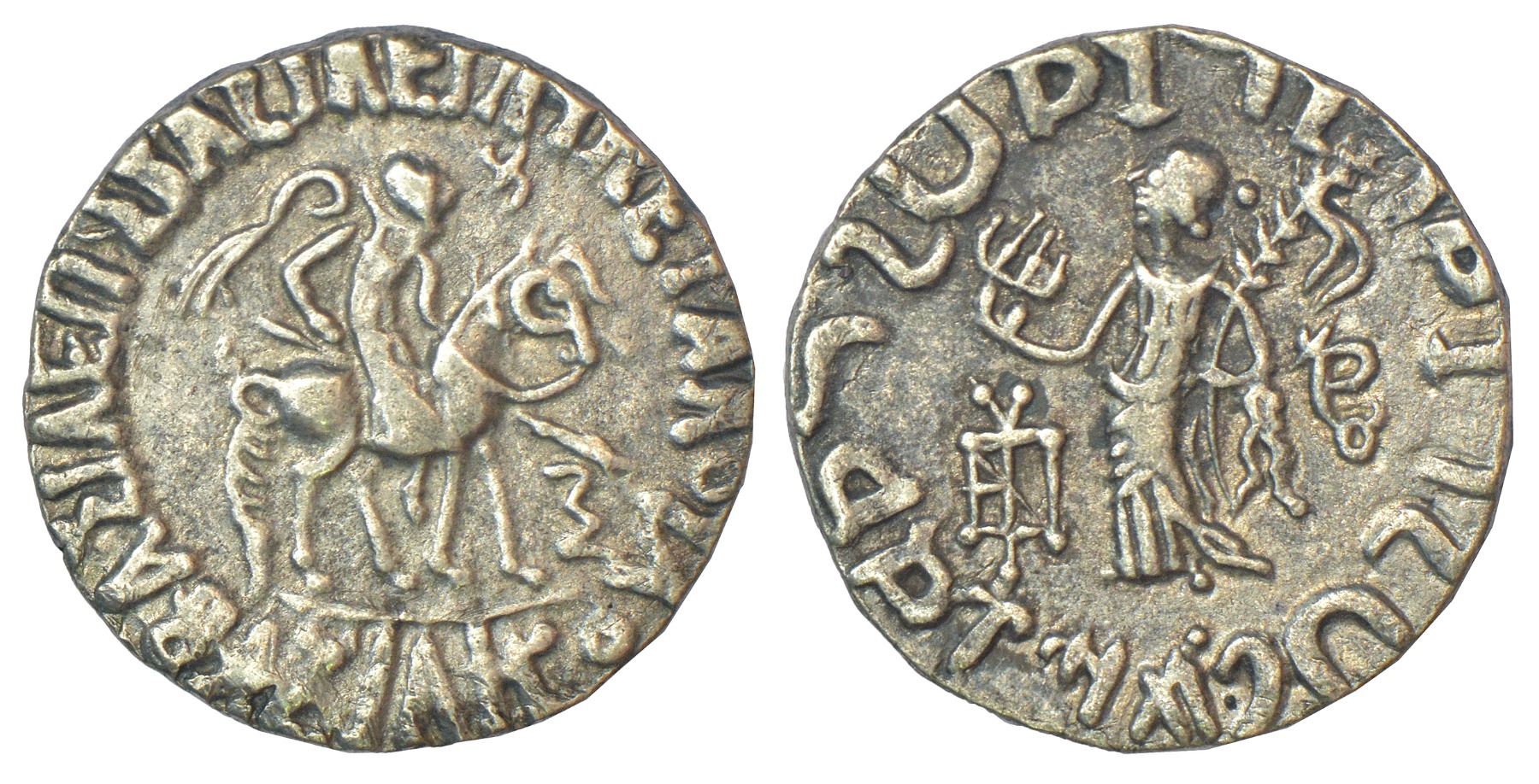 Indo-Scythians - silver tetradrachm of Azilises (c.57-35BC), ISCH 56.592T, 9.31g. Obv: King on horseback, wearing cataphractus and holding spear, Kharoshthi letter Di near head, and Dhra to right; Greek legend BASILEOS BASILEON MEGALOU AZILISOU around. Rev: Goddess Tyche standing left, holding lamp in right hand, palm tied with fillet in left; monogram to left, Kharoshthi letter Si joined to a Nandipada to right; Kharoshthi legend Maharajasa Rajarajasa Mahatasa Ayilishasa around.