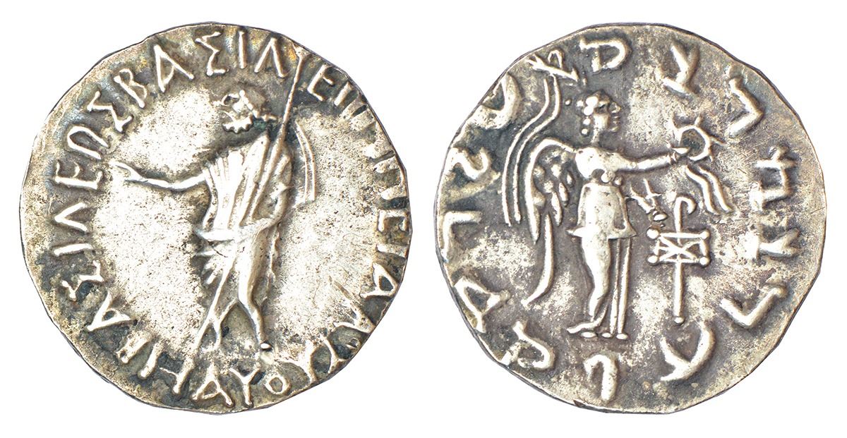 Indo-Scythians - silver tetradrachm of Maues (c.90-57 BC), ISCH 1.1T, 9.78g. Obv: Zeus standing carrying and large staff and making a gesture of benevolence; Greek legend BASILEOS BASILEON MEGALOU MAUOU around. Rev: winged Nike standing to right, holding aloft a wreath; Kharoshthi legend Rajatirajasa Mahatasa Moasa around and a monogram in the right field.