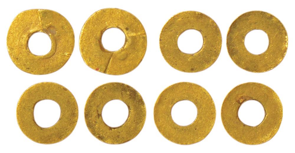 Indus Valley Civilization (mature phase, 2500-2000 BC), group of 4 gold rings/disks, to be strung into a necklace and possibly used for trade as primitive money, said to have been recovered from excavations at Harappan sites, weighs 0.05g, 0.07g, 0.08g and 0.09g; 3.54mm to 3.85mm.(4 disks)