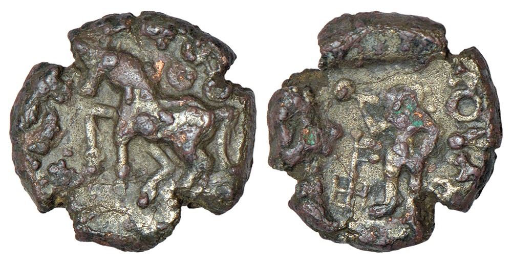 Kausambi/Vatsa region, monarchical series - copper coin of Jethamita (Jyeshthamitra), (c.50-100 AD), PAIC 1161, 5.50g. Obv: horse walking to left; 'Ujjain' symbol above. Rev: goddess standing holding aloft an object, tree-in-railing to left; Brahmi legend Jethamitasa to right.