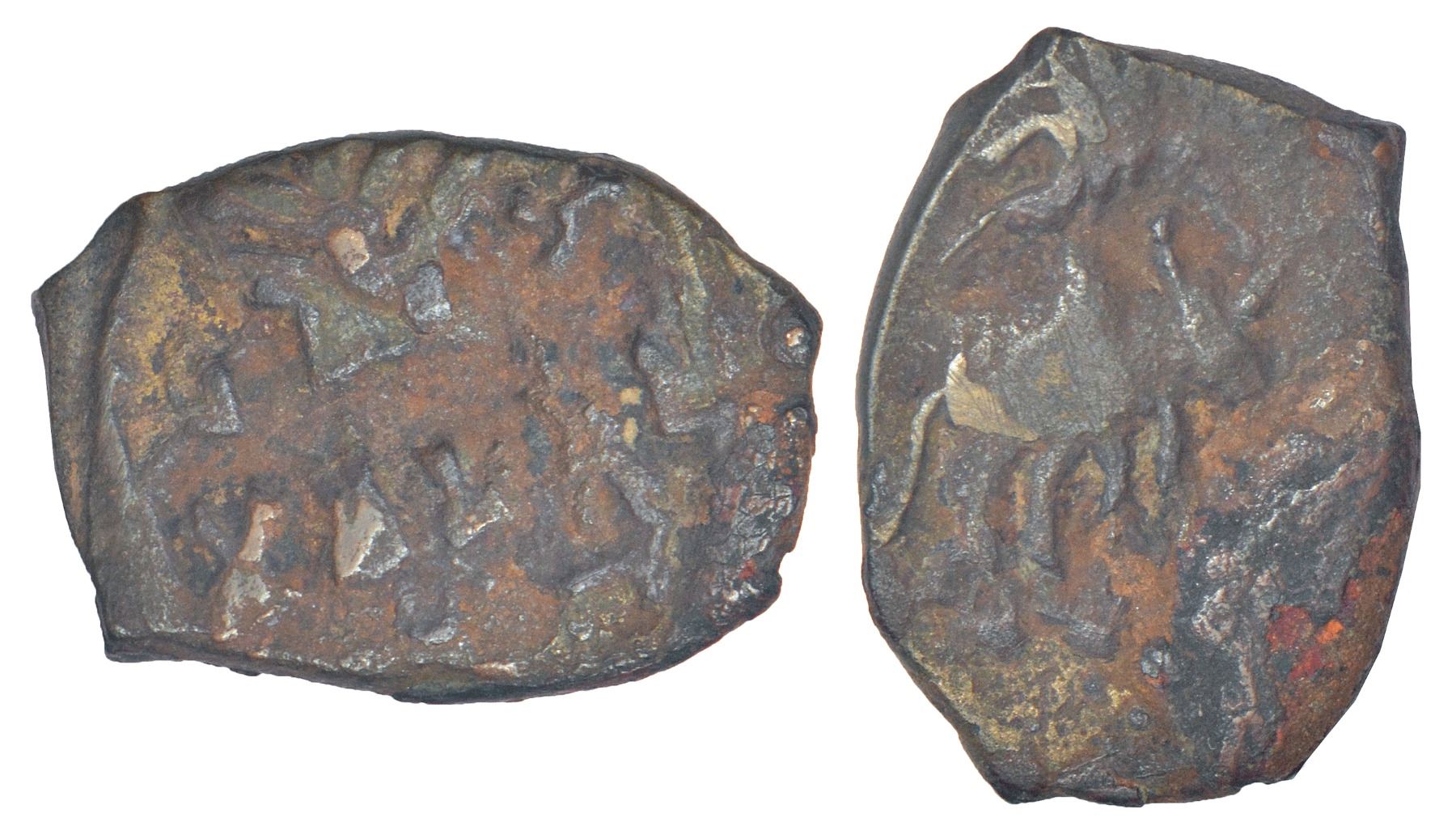 Kaushambi (Vatsa) - monarchical coinage attributed to post-Kushana period, (c.100-150 AD), uncertain ruler, 4.22g. Obv: Three-arched hill, tree-in-railing and a sacrificial post in a row; uncertain Brahmi legend Mavala…sa below. Rev: Bull walking to right, stylized conch shell above.