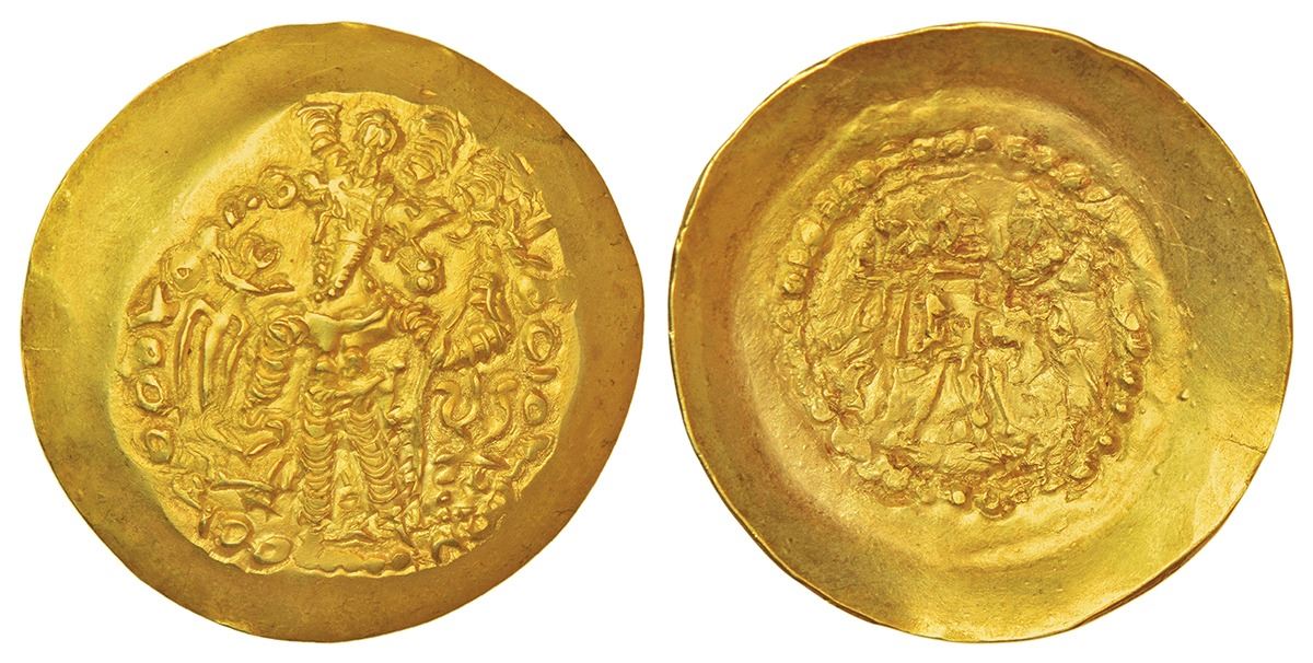 Kidarite Huns - gold dinar, (c. 340-345 AD), scyphate flan, struck in the name and type of Varhran of the Kushano-Sasanians during the reigns of Yasada and Kidara, Goebl-737, 7.15g. Obv: king standing left, wearing crown with lotus blossom, sacrificing over altar to left and holding trident, with filleted trident to left, Kidarite tamgha to right, Bactrian legend BAGO OARAERANO OOZORKO KOShANO ShAEO ("Lord Varahran the Great, Kushan king"). Rev: traces of deity standing facing, with flaming hair, holding wreath and trident, bull standing left behind.