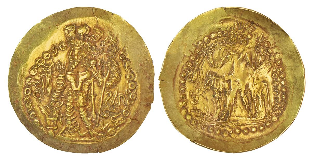Ancient India: Kidarite Huns, gold dinar struck in the name of Kushano-Sasanian king Varahran Kushanshah (c.330-350 AD), scyphate fabric, Göbl 718, 7.76g. Obv: King wearing Sasanian dress and crown with ribbons, carrying a sword and holding trident, standing left, making an offering at a fire altar; filleted trident to left, Kidarite tamgha in right field and crude Bactrian legend BAGO OARAERANO OOZORKO KOShANO ShAEO around. Rev: Siva (resembling the king) standing facing, holding diadem and trident; behind, bull Nandi standing, Bactrian legend in the right field, dotted border around.