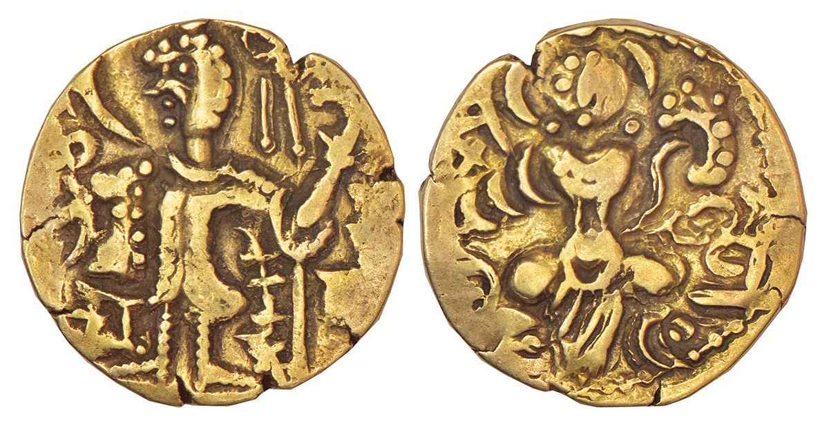 Kidarite Huns in Kashmir - base gold dinar in the name of 'Kidara', middle series, (c.350-450 AD), similar to MAC 3620, 7.88g. Obv: Stylized representation of Kushan-style king, facing left, offering sacrifice; Brahmi legend Kidara below arm, Shaka to left and traces of Kapana to right. Rev: Stylized depiction of seated goddess Ardokhsho, Brahmi letter A to right.