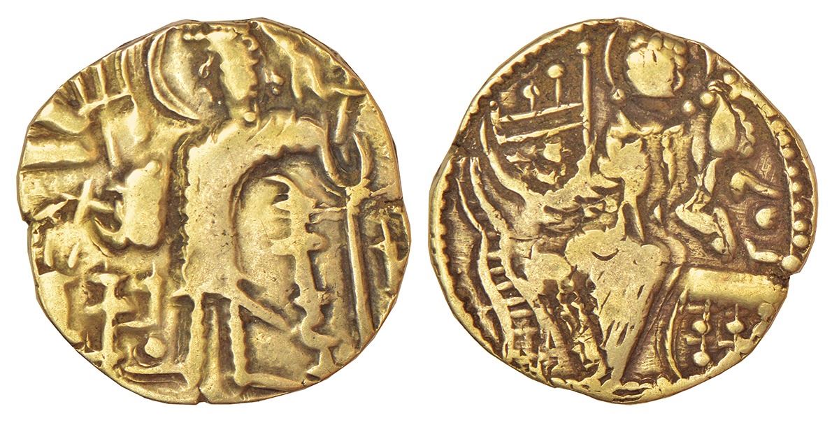 Kidarite Huns in Kashmir - base gold dinar in the name of 'Kidara', middle series, (c.350-450 AD), similar to MAC 3620, 7.75g. Obv: Stylized representation of Kushan-style king, facing left, offering sacrifice; Brahmi legend Kidara below arm, Shaka to left and traces of Kapana to right. Rev: Stylized depiction of seated goddess Ardokhsho.
