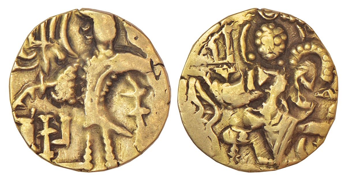 Kidarite Huns in Kashmir - base gold dinar in the name of 'Kidara', middle series, (c.350-450 AD), similar to MAC 3620, 7.85g. Obv: Stylized representation of Kushan-style king, facing left, offering sacrifice; Brahmi legend Kidara below arm and Shaka to left. Rev: Stylized depiction of seated goddess Ardokhsho, traces of Brahmi letters to right.
