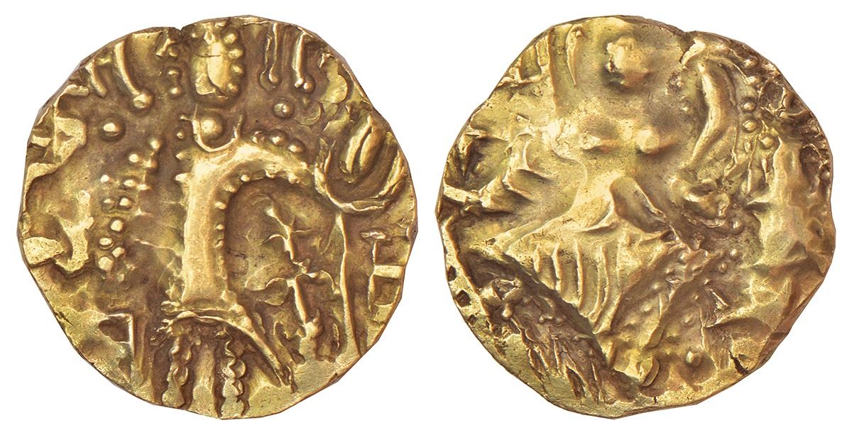 Kidarite Huns in Kashmir - base gold dinar in the name of 'Narendra', (c.400-500 AD), 7.87g. Obv: Kushan-style king standing offering sacrifice at an altar; crude Brahmi legend Kidara under the arm and traces of Kapana to right. Rev: Goddess seated facing; crude Brahmi legend Shri Narendra inscribed vertically to right.