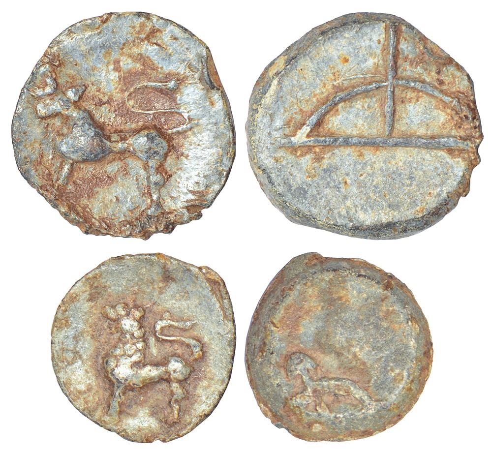 Kumaras of Karhad - two uninscribed 'lion' type lead coins, not listed in PAIC, 2.11 and 1.55g, respectively. Obv: lion facing left. Rev: strung bow-and-arrow. (2 coins)