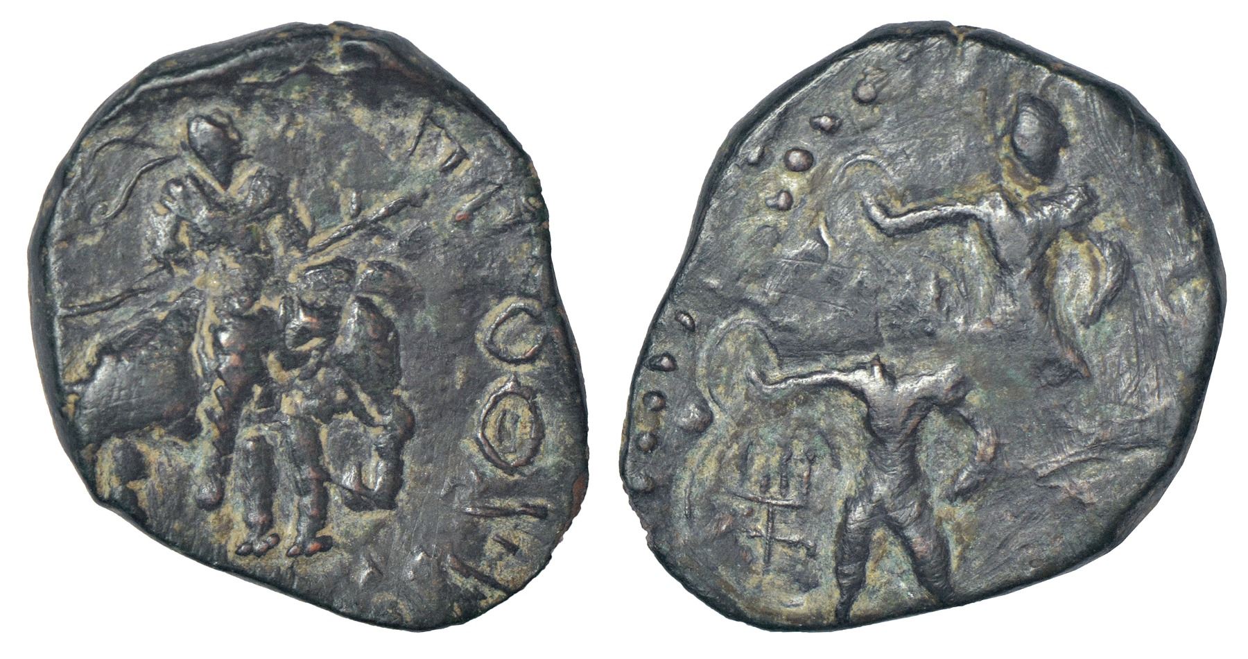 Kushans - copper tetradrachm of Huvishka (c.152-190 AD), reduced standard, similar to Goebl 930, 9.42g. Obv: King riding on elephant, holding goad), facing right; traces of Bactrian legend around. Rev: Moon god Mao standing left, extending hand, holding wreath, with tamgha below (double struck).