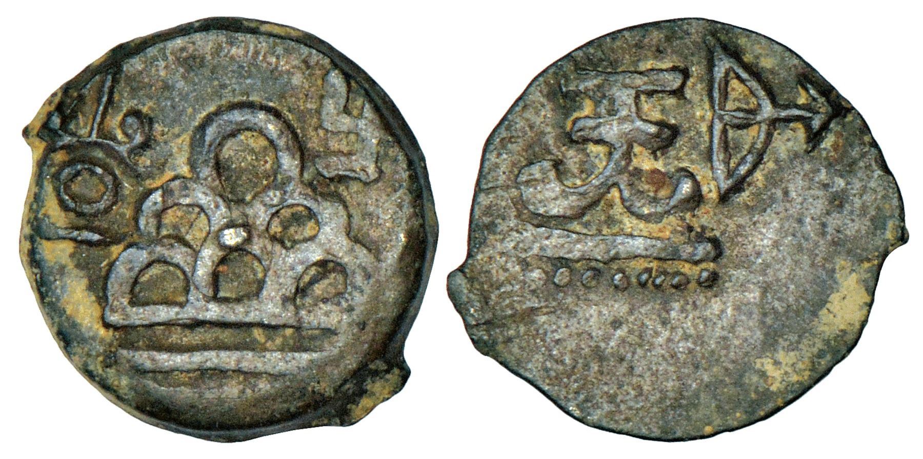 Lesser Satavahanas of Banavasi, uninscribed lead coin, (200-250 AD), K. Ganesh 'Karnataka' 3.35 var., 1.85g. Obv: Six arched hill, Nandipada to left and swastika to right. Rev: Stylized triangle-headed standard, strung bow and arrow to right.