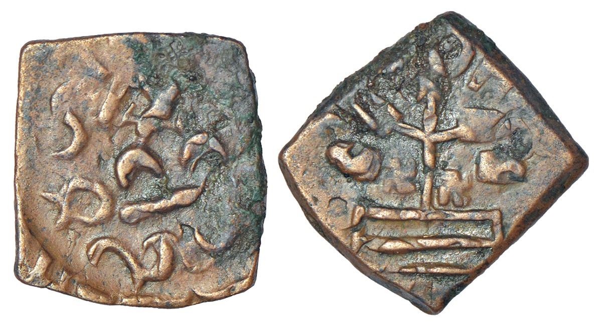 Maharathis in Marathwada/Vidarbha - rectangular copper coin of Maharathi Talanthati (c. mid-1st century AD), similar to PAIC 2525, 4.02g. Obv: Three-arched hill with crescent, small symbols on either side; Brahmi legend Maharathi….tisa around. Rev: Tree in railing, with small Swastikas, under branches, to left and right.