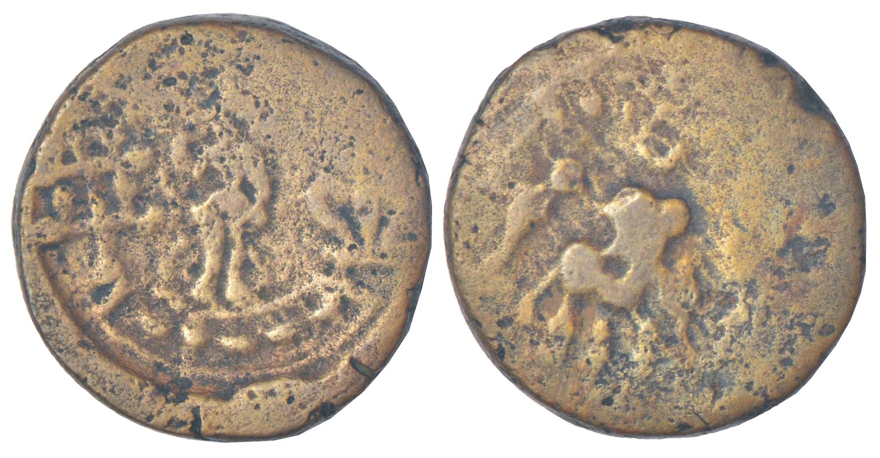 Mathura - post-Mauryan monarchical coinage, arsenical bronze coin of Suryamitra (c.100-50 BC), PAIC 1268, 7.85g. Obv: Goddess standing facing, tree to left, Shrivatsa to right, river symbol below; traces of Brahmi legend Suyamitasa above. Rev: Composite depiction of three conjoined elephants with a goddess riding on the central animal.
