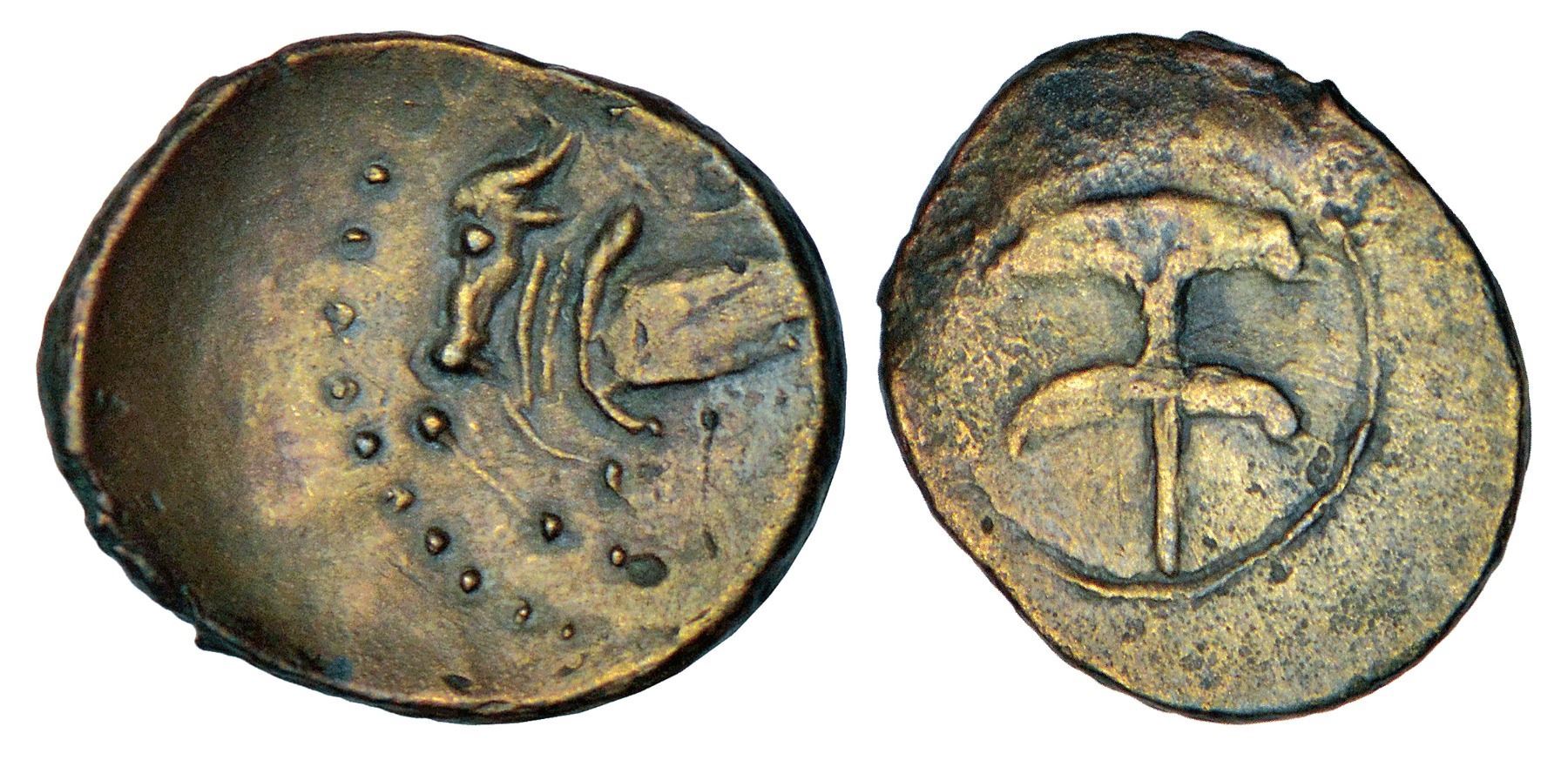Pallavas of Kanchi, uninscribed 'bull' type coin in alloyed copper, (300-400 AD), similar to Krishnamurthy 64-65, 2.64g. Obv: Bulla standing facing left. Rev: Bold Shrivatsa symbol within a circle.