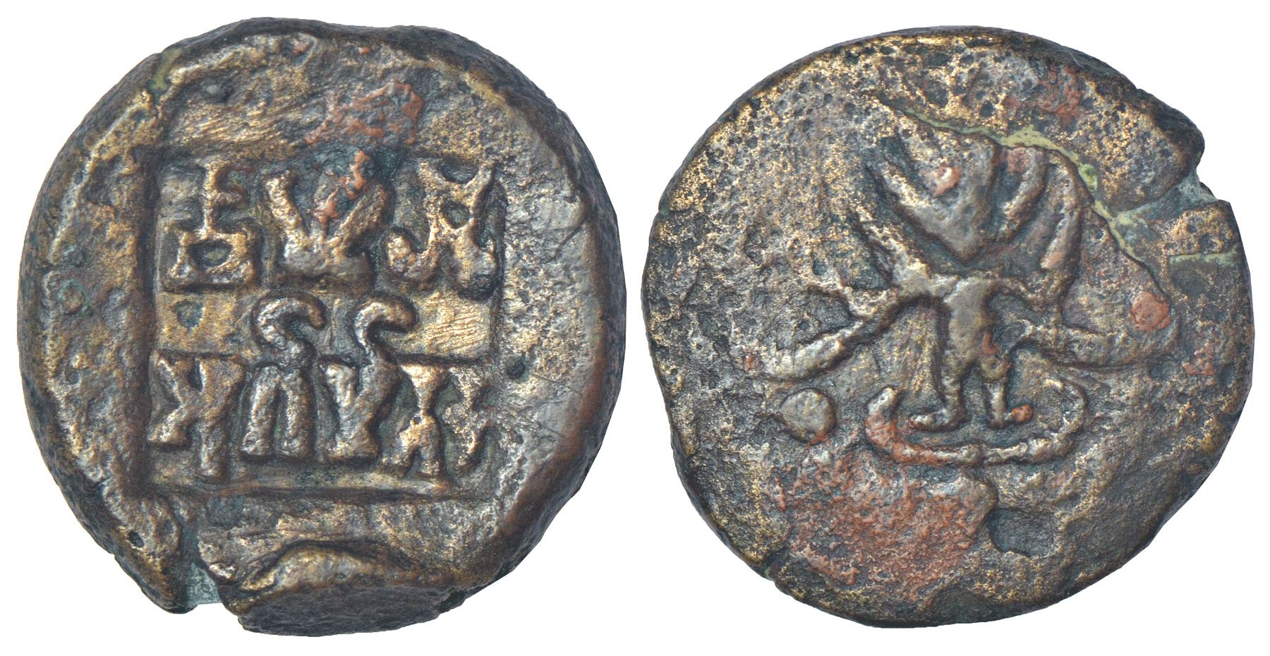 Panchala, post-Mauryan monarchical coinage - alloyed copper fractional unit of Agnimitra (c.50BC- 50AD), not listed in PAIC, 12.51g. Obv: Rectangular incuse with three symbols in a row and Brahmi legend Agimitrasa below. Rev: Goddess 'Agni' standing on a lotus.