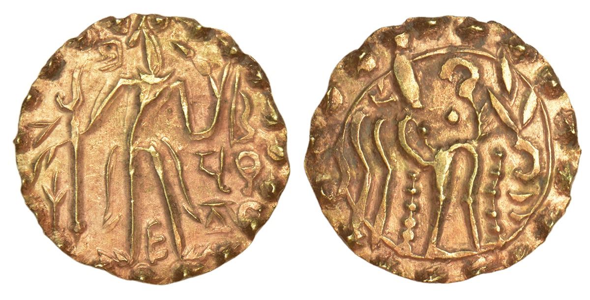 Post-Gupta coinage in Bengal, Samatata region - gold dinar of Prithubhata, king of Khadga dynasty (c.700-750 AD), ECB SAM19.1, 5.77g. Obv: stylised representation of 'archer' king holding bow and arrow in each hand, 'Shankha' standard in the backdrop; Brahmi letter Shri to the left of the head, Ja between the legs and legend Prthu/Bhata in two lines below the bow. Rev: Stylised representation of goddess, facing right making a gesture of reassurance, with curved lines (drapery?) behind her back; crude inscription to right.